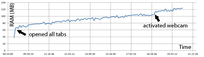 The application keeps track of the history of snapshots added and special events that occur. Because of this housekeeping function the RAM usage will gradually increase because more information in stored in the interface (the image list and the event logger). This is what you can expect to happen>